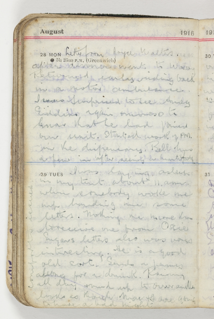 Letter from Joyce Walters. After dinner went to Warloy. Returned early riding back in a motor ambulance. I was surprised to see Andy Giddins again & moreso to know that he had joined our unit. Started work 7 pm. in the dispensary. Bell has a few in after seeing a [indecipherable]