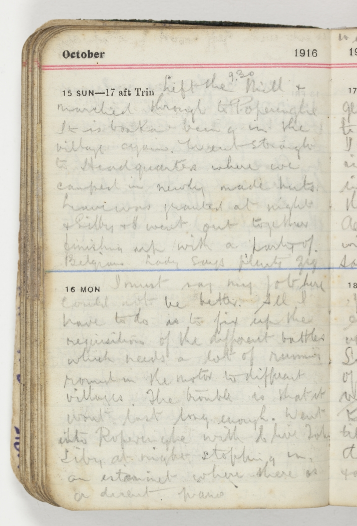 I must say my job here could not be better. All I have to do is to fix up the requisitions of the different battles which needs a lot of running round in the motor to different villages. The trouble is that it wont last long enough. Went into Poperinghe with Clive [indecipherable] at night stopping in an estaminet where there is decent [piano]