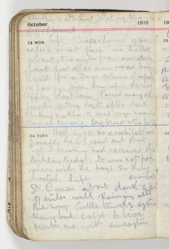 Fell in 10.30 & whilst on parade the O.C. read out that Sgt Christmas had received the Military Medal. It was not [popular] with the boys so they [hooted]. Left St. Omer about dark after 17 miles walk. Raining all the way. Cattle trucks again. Very bad cold Clive rubs me with eucaytus.