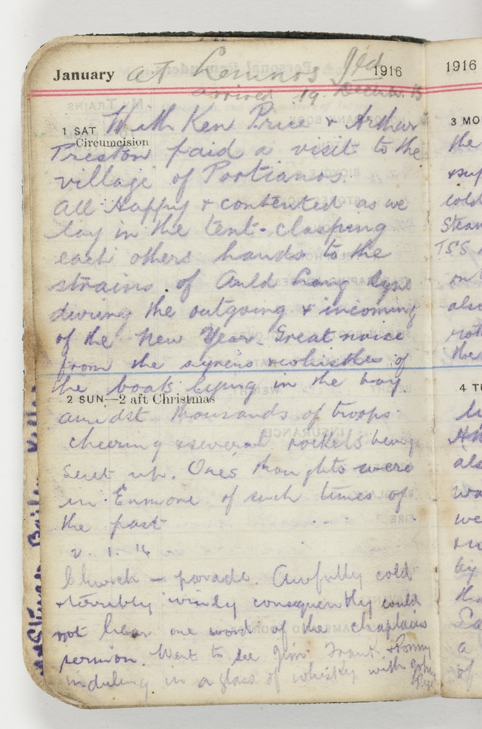All Happy & contented as we lay in the tent – clasping each others hands to the strains of Auld Lang Syne during the outgoing & incoming of the New Year. Great noise from the syrens & whistles of the boats lying in the bay, amidst thousands of troops, cheering & several rockets being sent up. Ones thoughts were in Enmore of such times of the past.
