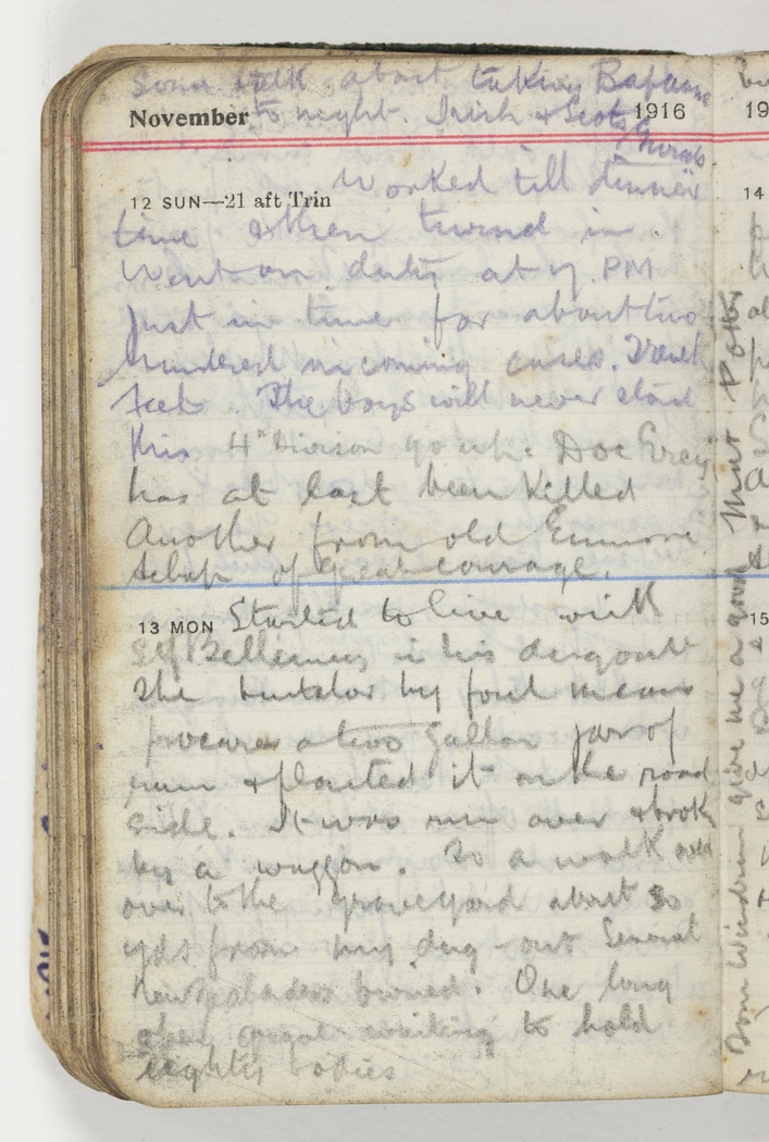 Worked till dinner time & then turned in. Went on duty at 7. pm just in time for about two hundred incoming cases. Trench Feet. The boys will never [stand] this. 4th Division go up. Doc Grey has at last been killed. Another from old Enmore. A chap of Great courage.