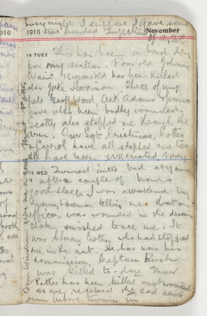 This has been a bad day for my section. Poor old Johnny Wain 18 years old has been Killed also Jake Harrison. Three of my pals Geoff Wood, Ack Adams, & [Jenno] have also been badly wounded. Scotty also stopped one through the arm. Our Sgt Christmas, Cotter & Carrol have all stopped one too. All have been evacuated. Very [text continued at top of page]