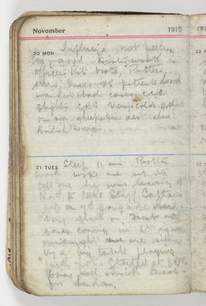 Influenza not feeling too good. Dirty work officers Kit boots, Puttees, cars, buses 25 patients took wounded & bad cases C.C.S. slight C.R.S. Very cold 4 shirts on & a sheepskin vest also British warm.