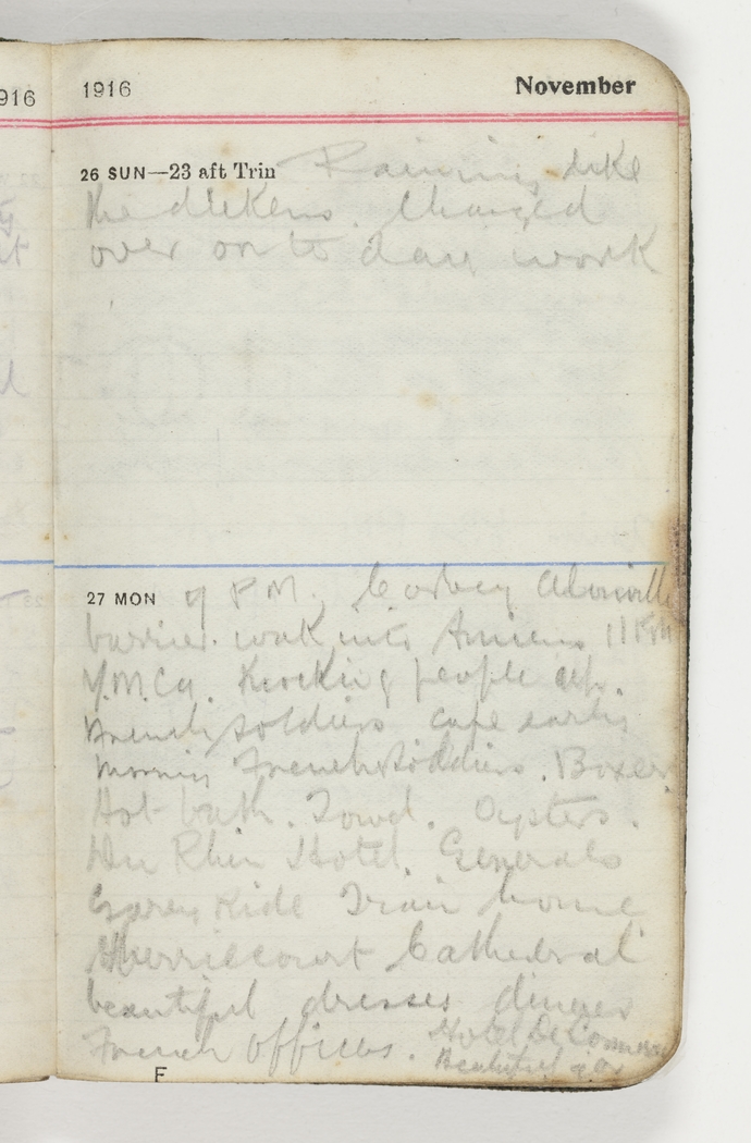 9 pm. Corbey Alonville barrier. [wak] into Amiens 11 pm Y.M.C.A. knocking people up. French soldiers cafe early morning French soldiers. Boxer. Hot bath. Towel. Oysters. Du Rhin Hotel. Generals Garey Ride Train home. [Merriecourt] Cathedral beautiful dresses dinner French Officers. Hotel De [indecipherable] Beautiful