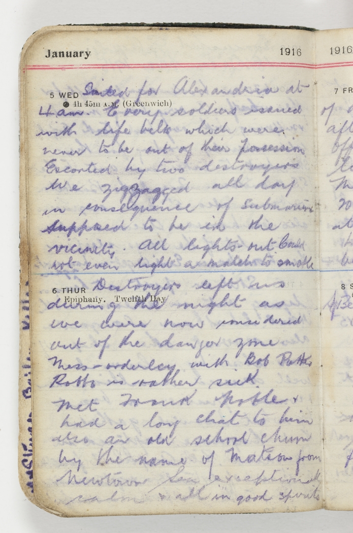 Sailed for Alexandria at 4 am. Every soldiers issued with life belts which were never to be out of their possession. Escorted by two destroyers. We zigzagged all day in consequence of submarine supposed to be in the vicinity. All lights out. Could not even light a match to smoke.