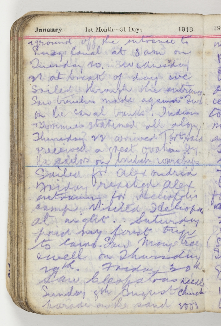 Wednesday 21 at break of day we sailed through the entrance. Saw trenches made against Turk on the canal banks. Indians & Tommies stationed all along.