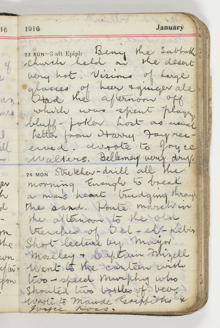 Stretcher-drill all the morning. Enough to break a man's heart trudging through the sand. Route march in the afternoon to the old trenches of Tel-el-Kebir. Short lecture by Major Moseley & Captain Frizell. Went to the canteen with two-speed Murphy who shouted two bottles of beer. Wrote to Maude Griffiths & Joyce Ross.