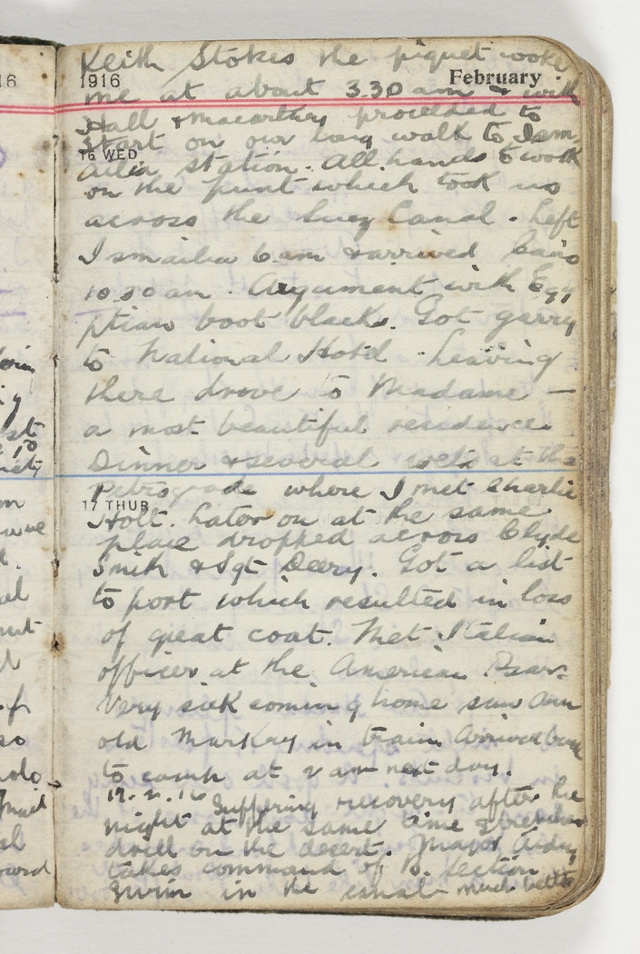 Argument with Egyptian boot black. Got garry to National Hotel. Leaving there drove to Madame – a most beautiful residence. Dinner & several wets at the Petrograde where I met Charlie Holt. Later on at the same place dropped across Clyde Smith & Sgt Deery. Got a list to port which resulted in loss of great coat. Met Italian officer at the American Bar. Very sick coming home saw Arnold Markey in train. Arrived back to camp at 2 am next day.