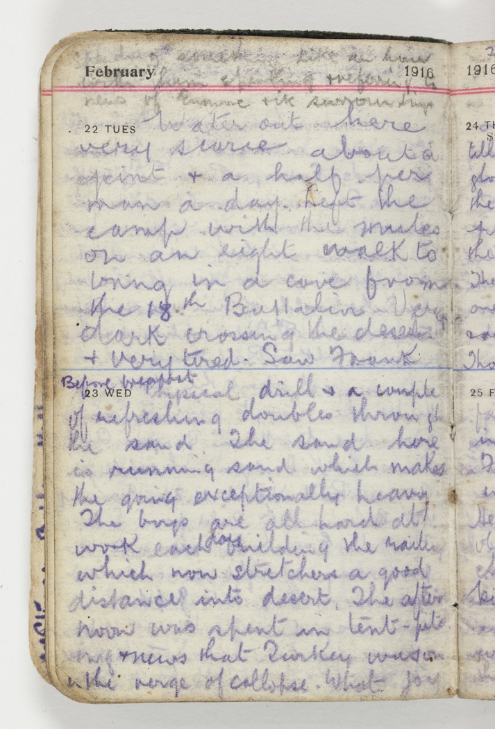 Water out here very scarce about a pint & a half per man a day. Left the camp with the mules on an eight walk to bring in a cove from the 18th Battalion. Very dark crossing the desert & very tired. Saw Frank [text continues at top of page].