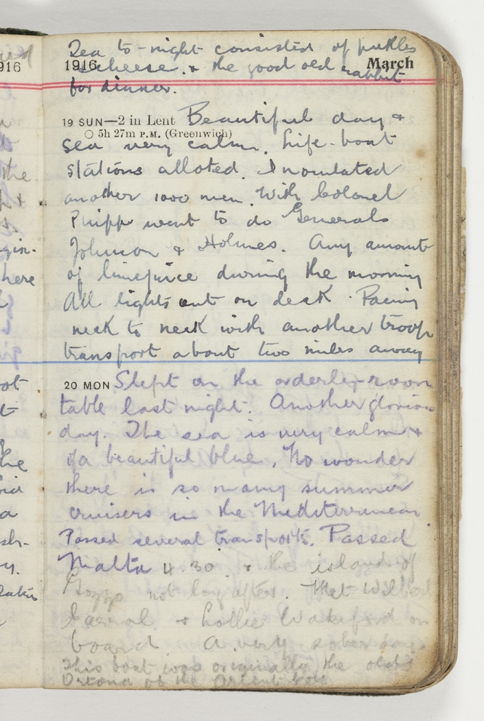 Slept on the orderley room table last night. Another glorious day. The sea is very calm & of a beautiful blue. No wonder there is so many summer cruisers in the Mediterranean. Passed several transports. Passed Malta 4.30 & the island of Gozzo not long after. Met Wilbert Carroll & [indecipherable] Wakeford on board. A very sober day. This boat was originally the old Ortana of the [Orient line].
