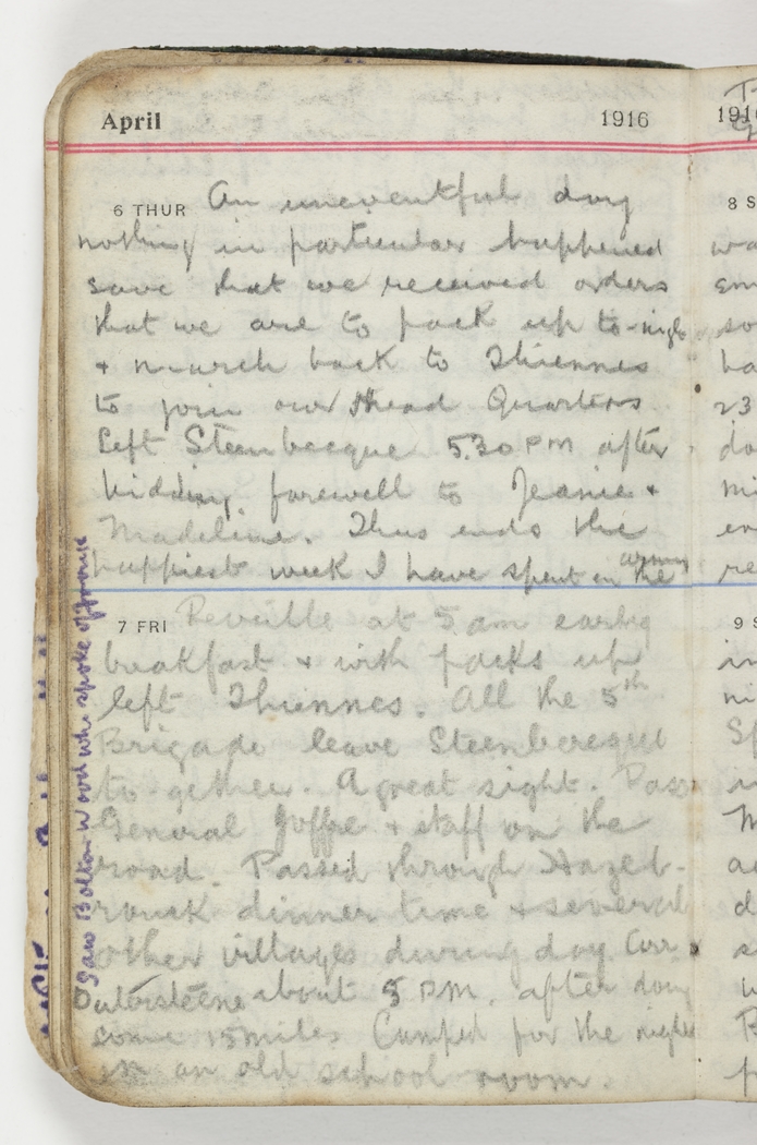 An uneventful day nothing in particular happened save that we received orders that we are to pack up to-night & march back to Thiennes to join our Head Quarters. Left Steenbecque 5.30 pm after bidding farewell to Jeanie & Madeline. Thus ends the happiest week I have spent in the army.