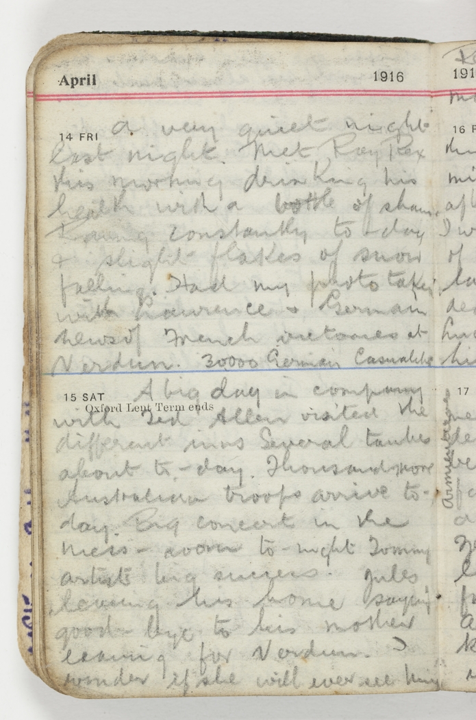 A big day in company with Ted Allen visited the different inns. Several taubes about to-day. Thousands more Australian troops arrive to-day. Big concert in the mess-room to-night. Tommy artists big success. Jules leaving his home saying good-bye to his mother leaving for Verdun. I wonder if she will ever see him