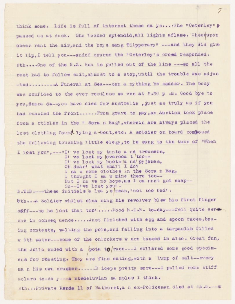 One of the N.Z. Boats pulled out of the line - so all the rest had to follow suit, almost to a stop, until the trouble was adjusted. A Funeral at Sea - can anything be sadder. The body was confided to the ever restless waves at 9.30 p.m. Good bye to you, comrade - you have died for Australia, just as truly as if you had reached the front. From grave to gay, an Auction took place from articles in the " Scran Bag", wherein are always placed the lost clothing found lying about, etc. A soldier on board composed the following touching little elegy, to be sung to the tune of "When I lost you",