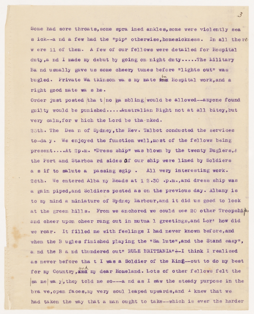 We entered Albany Heads at 12.30 p.m., and dress ship was again piped, and Soldiers posted as on the previous day. Albany is to my mind a miniature of Sydney Harbour, and it did us good to look at the green hills. From we anchored we could see 20 other Troopships and cheer upon cheer rang out in mutual greetings, and Lor' how did we roar. It filled me with feelings I had never known before, and when the Bugles finished playing the "Salute", and the "Stand easy", and the Band thundered out "Rule Brittania" - I think I realised as never before that I was a Soldier of the King - out to do my best for my Country, and my dear Homeland. Lots of other fellows felt the same way, they told me so - and as I saw the steady purpose in the brave, open faces, my very soul leaped upwards, and I knew that we had taken the way that a man ought to take - which is ever the harder