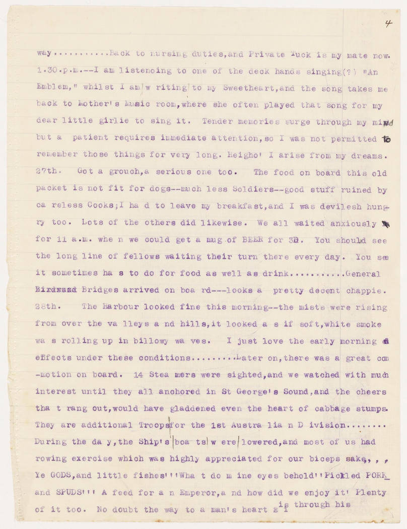 Got a grouch, a serious one too. The food on board this old packet is not fit for dogs - much less Soldiers - good stuff ruined by careless Cooks; I had to leave my breakfast, and I was devilish hungry too. Lots of the others did likewise. We all waited anxiously for 11 a.m. when we could get a mug of Beer for 3d. You should see the long line of fellows waiting their turn there every day. You see it sometimes has to do for food as well as drink. General Birdlwood Bridges arrived on board - looks pretty decent chappie.