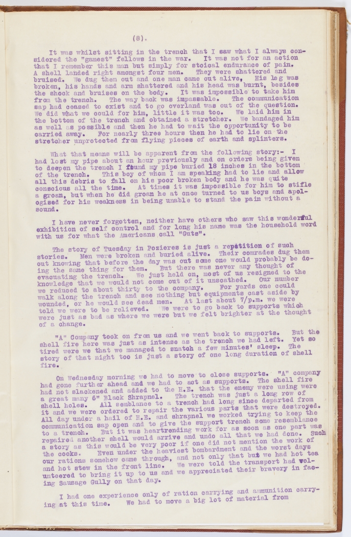 The story of Tuesday in Pozieres is just a repetition of such stories. Men were broken and buried alive. Their comrades dug them out knowing that before the day was out some one would probably be doing the same for them. But there was never any thought of evacuating the trench. We just held on, most of us resigned to the knowledge that we would not come out of it unscathed. Our number we reduced to about thirty to the company. For yards one could walk along the trench and see nothing but equipments cast aside by wounded, or he would see dead men. At last about 7pm we were told we were to be relieved. We were to go back to supports which were just as bad as where we were but we felt brighter at the thought of a change.