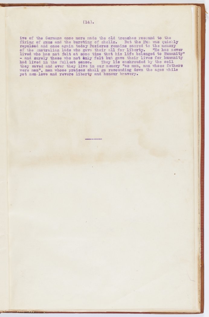of the Germans once more made the old trenches resound to the firing of guns and the bursting of shells. But the Hun was quickly repulsed and once again today Pozieres remains sacred to the memory of the Australian lads who gave their all for liberty. " He has never lived who has not only felt at some time that his life belonged to Humanity"- and surely these who not only felt but gave their lives for humanity had lived in the fullest sense. They lie enshrouded by the soil they saved and ever they live in our memory "as men, men whose fathers were men" men whose praises shall go resounding down the ages while yet men love and rever liberty and honour bravery.