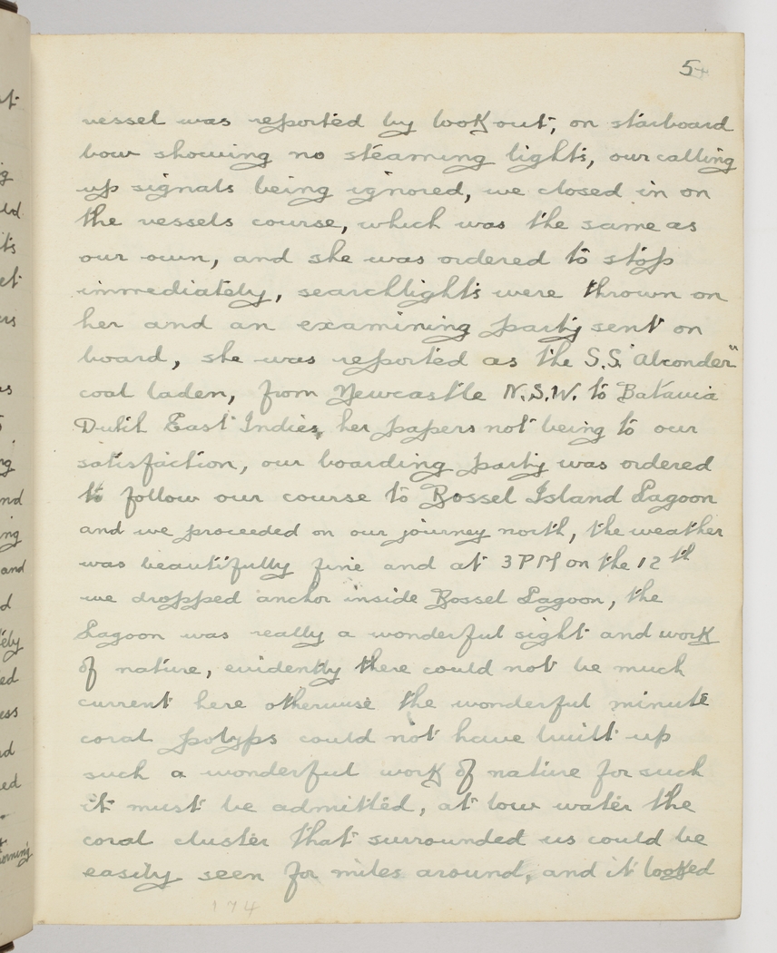 vessel was reported by look-out, on starboard bow showing no steaming lights, our calling up signals being ignored, we closed in on the vessels course, which was the same as our own, and she was ordered to stop immediately, searchlights were thrown on her and an examining party sent on board, - she was reported as the "S.S. Alconder" coal laden, from Newcastle N.S.W. to Batavia Dutch East Indies, her papers not being to our satisfaction, our boarding party was ordered to follow our course to Rossel Island Lagoon and we proceeded on our journey north, - the weather was beautifully fine and at 3 PM on the 12th we dropped anchor inside Rossel Lagoon, the Lagoon was really a wonderful sight and work of nature, evidently there could not be much current here otherwise the wonderful minute coral polyps could not have built up such a wonderful work of nature for such it must be admitted, at low water the coral cluster that surrounded us could be easily seen for miles around, and it looked