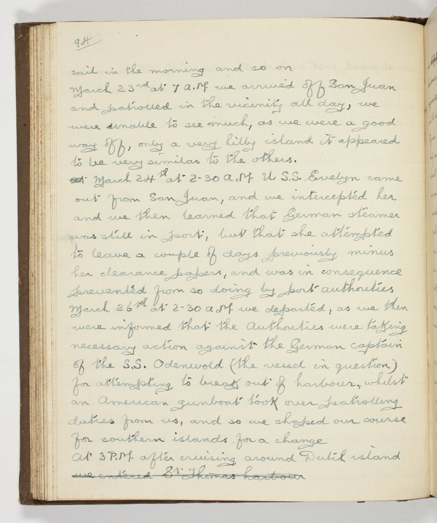 March 24th at 2.30 A.M. USS. Evelyn came out from San Juan, and we intercepted her and we then learned that German steamer was still in port, but that she attempted to leave a couple of day previously minus her clearance papers, and was in consequence prevented from doing so by port authorities