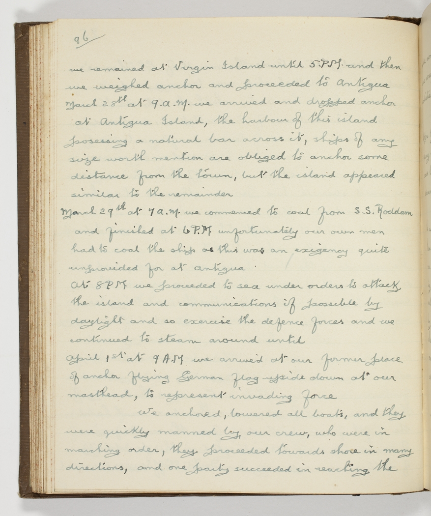 March 29th at 7 A.M. we commenced to coal from S.S. Roddam and finished at 6 P.M. – unfortunately our own men had to coal the ship as this was an exigency quite unprovided for at Antigua – At 8 PM we proceeded to sea with orders to attack the island and communications if possible by daylight and so exercise the defence forces and we continued to steam around until
