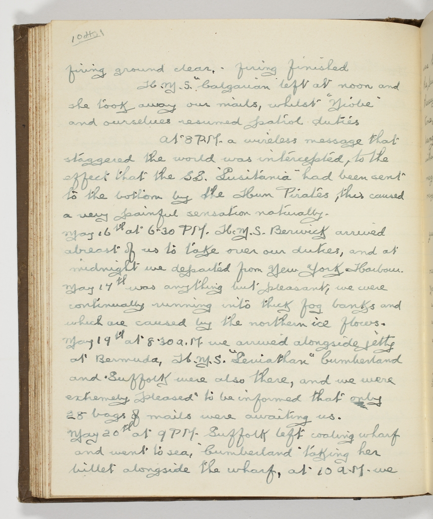 firing ground clear, - firing finished – H.M.S. "Calgarian" left at noon and she took away our mails, whilst "Niobe" and ourselves resumed patrol duties – At 8 PM a wireless message that staggered the world was intercepted, to the effect that the "SS. "Lucitania" had been sent to the bottom by the Hun Pirates, - this caused a very painful sensation naturally.