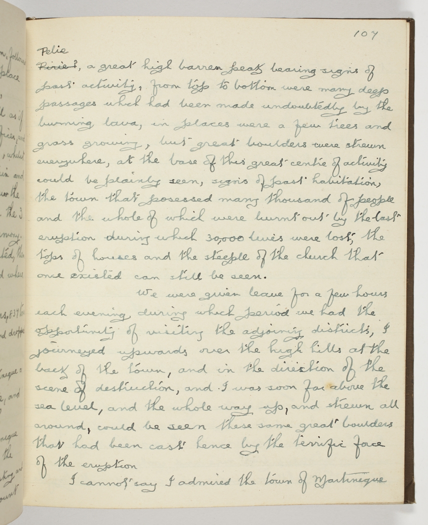 Pelie [Pelee] a great high barren peak bearing signs of past activity, - from top to bottom were many deep passages which had been made undoubtedly by burning lava, - in places were a few trees and grass growing, but great boulders were strewn everywhere, - at the base of this centre of activity could be plainly seen, signs of past habitation, - the town that posessed many thousands of people and the whole of which were burnt out by the last eruption during which 30,000 lives were lost, - the tops of houses and the steeple of the church that once existed can still be seen.