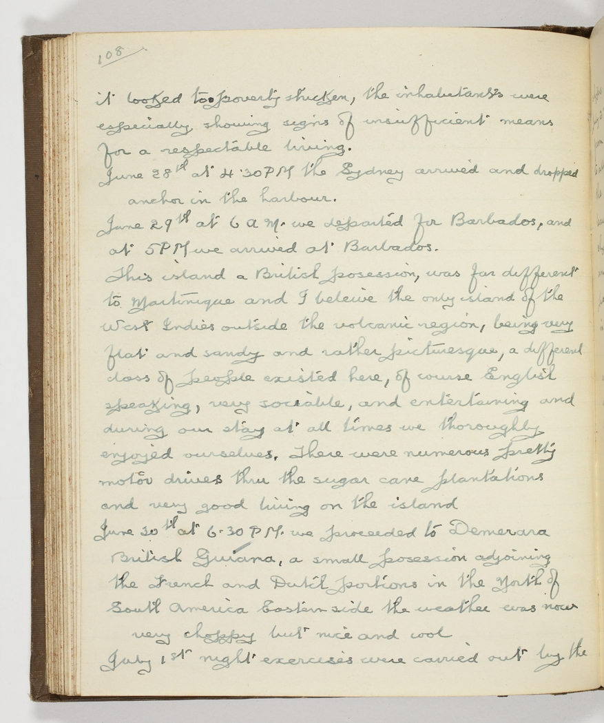 June 29th at 6 am. we departed for Barbados, and at 5 PM we arrived at Barbados. This island a British possession, was far different to Martinique and I believe the only island of the West Indies outside the volcanic region, being very flat and sandy and rather picturesque, - a different class of people existed here, of course English speaking, very sociable, and entertaining and during our stay at all times we thoroughly enjoyed ourselves. There were numerous pretty motor drives thru the sugar plantations and very good living on the island