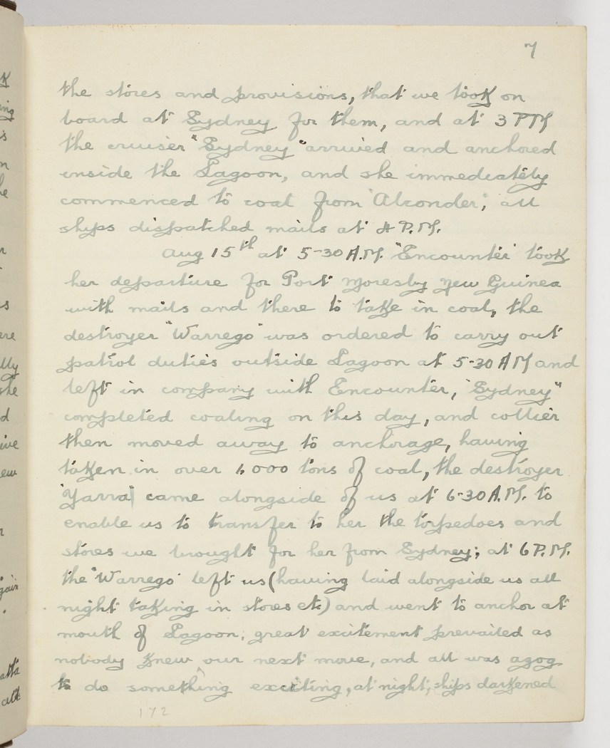 Aug 15th 5.30 A.M. "Encounter" took her departure for Port Moresby New Guinea with mails and there to take in coal, - the destroyer "Warrego" was ordered to carry out patrol duties outside the Lagoon at 5.30 AM and left in company with Encounter, - "Sydney" completed coaling on this day, and collier then moved away to anchorage, having taken in over 1,000 tons of coal, the destroyer "Yarra" came alongside of us at 6.30 A.M. to enable us to transfer to her the torpedoes and stores we brought for her from Sydney; - at 6 P.M. the "Warrego" left us (having laid alongside us all night taking in stores etc) and went to anchor at mouth of Lagoon, - great excitement prevailed as nobody knew our next move, and all was agog to do something exciting, at night, ships darkened.
