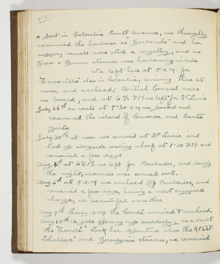 a port in Colombia South America, - we thoroughly examined the harbour as "Karlsruhe" and her supply vessels were still a mystery, and we knew a German steamer was harbouring inside – We left here at 8 am. for "Savanilla" also in Colombia, arriving there at noon and anchored; British Consul came on board, and at 6 o/c PM we left for St Lucia