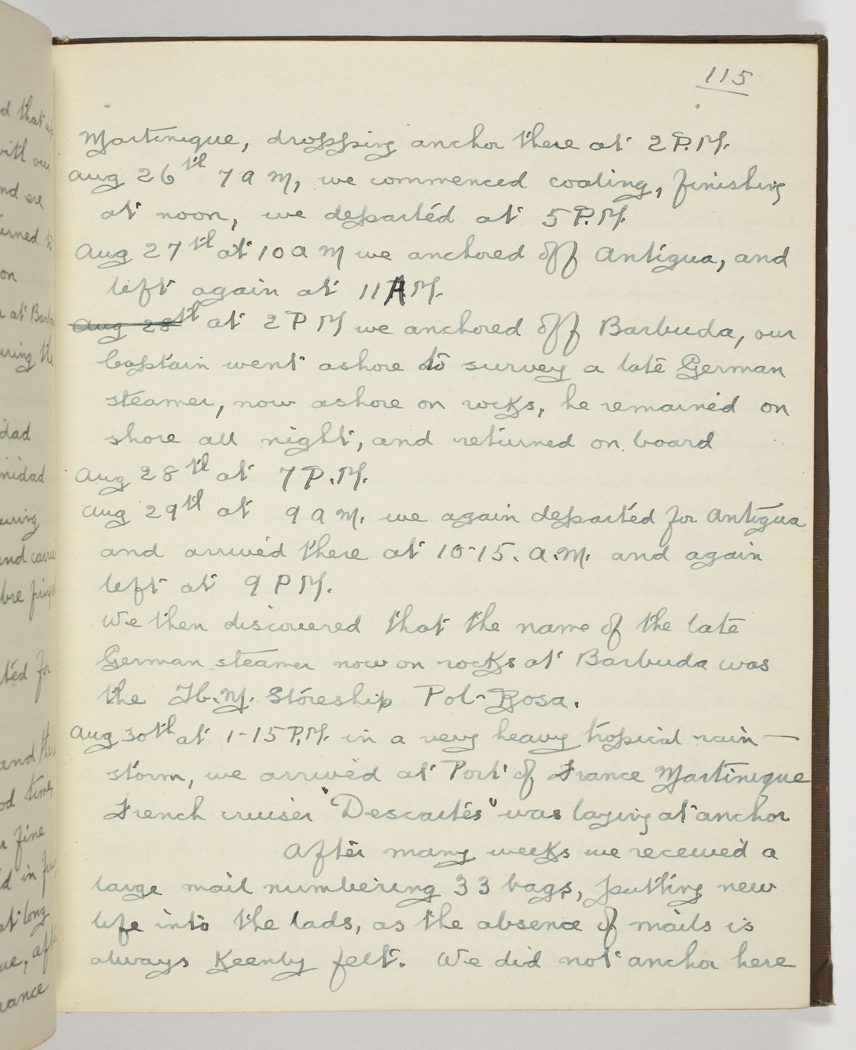 Aug 29th at 9 am. we again departed for Antigua and arrived there at 10.15 a.m. and again left at 9 PM. We then discovered that the name of the late German steamer now on rocks at Barbuda was the H.M. Storeship Pol-Rosa.