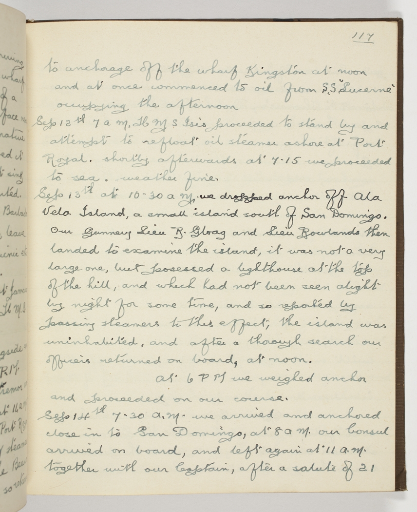 Sep 13th at 10.30 am we dropped anchor off Ala Vela Island, small island of San Domingo. Our Gunnery Lieu R. Gloag and Lieu Rowlands then landed to examine the island, - it was not a very large one, but posessed a lighthouse at the top of the hill, and which had not been seen alight by night for some time, and so reported by passing steamer to this effect, - the island was uninhabited, and after a thorough search our officers returned on board, at noon. At 6 PM we weighed anchor and proceeded on our course.