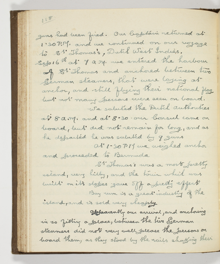 Sep 16th [1915] at 7 a.m. we entered the harbour of St Thomas and anchored between two German steamers, that were laying at anchor, and still flying their national flag but not many persons were seen on board. We saluted the Dutch authorities at 8 a.m. and at 8.30 our Consul came on board, but did not remain for long, and as we departed he was saluted by 9 guns – At 1.30 PM we weighed anchor and proceeded to Bermuda