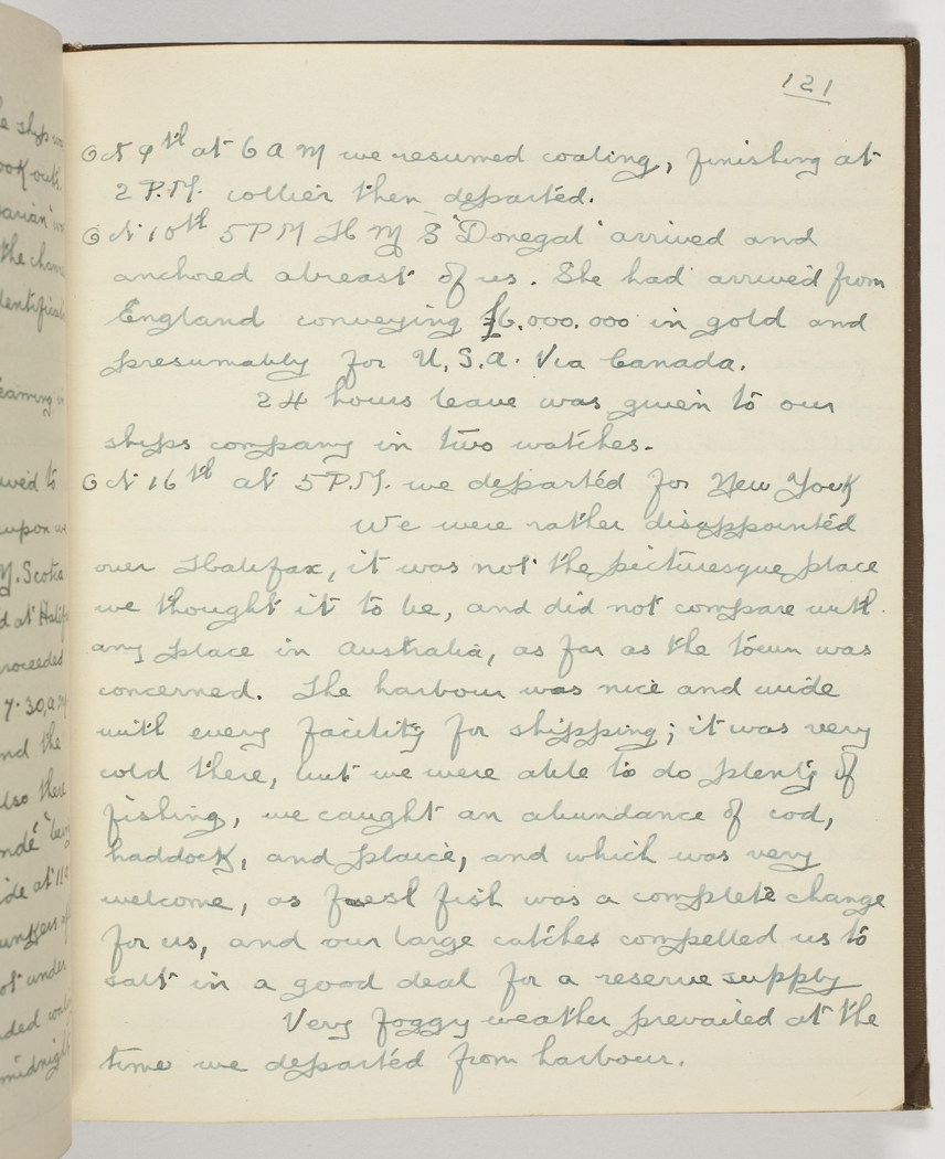 Oct 16th at 5 P.M. we departed for New York – We were rather disappointed over Halifax, it was not the picturesque place we thought it to be, and did not compare with any place in Australia, as far as the town was concerned. The harbour was nice and wide with every facility for shipping; - it was very cold there, but we were able to do plenty of fishing, - we caught an abundance of cod, haddock, and plaice, and which was very welcome, as fresh fish was a complete change for us, and our large catches compelled us to salt in a good deal for a reserve supply – Very foggy weather prevailed at the