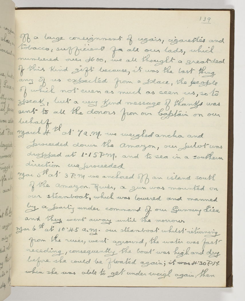 Mar 5th at 3 PM we anchored off an island south of the Amazon River, a gun was mounted on our steamboat, which was lowered and manned by a party under command of our Gunnery Lieu and they went away until the morrow