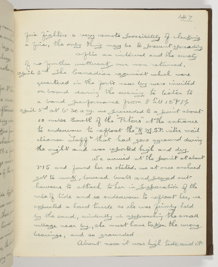 April 2nd [1916] The Canadian regiment which were quartered in the forts near by were invite on board during the evening to listen to a band performance from 8 till 10 PM