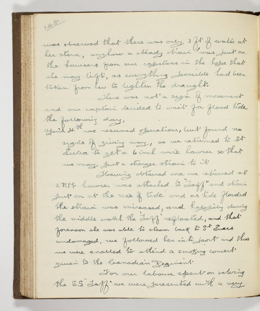 April 4th we resumed operations, but found no signs of giving way, so we returned to St Lucia to get a 6 inch wire hawser so that we may put a stronger strain to it – Having obtained one we returned at 2 P.M. – hawser was attached to "Taff" and strain put on at the rise of tide and as tide flooded the strain was increased, and happily during the middle watch the "Taff" refloated, and that forenoon she was able to steam back to St Lucia undamaged, - we followed her into port and thus we were enabled to attend a smoking concert given to the Canadian Regiment – For our labour spent on salving the S.S "Taff" we were presented with a very