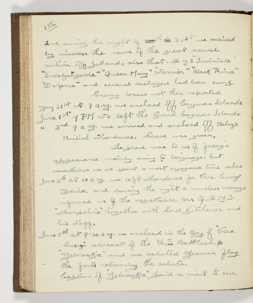 June 5th at 10 am. we left Honduras for Vera Cruz Mexico. and during the night a wireless message informed us of the regrettable loss of H.M.S. "Hampshire" together with Lord Kitchener and his staff.