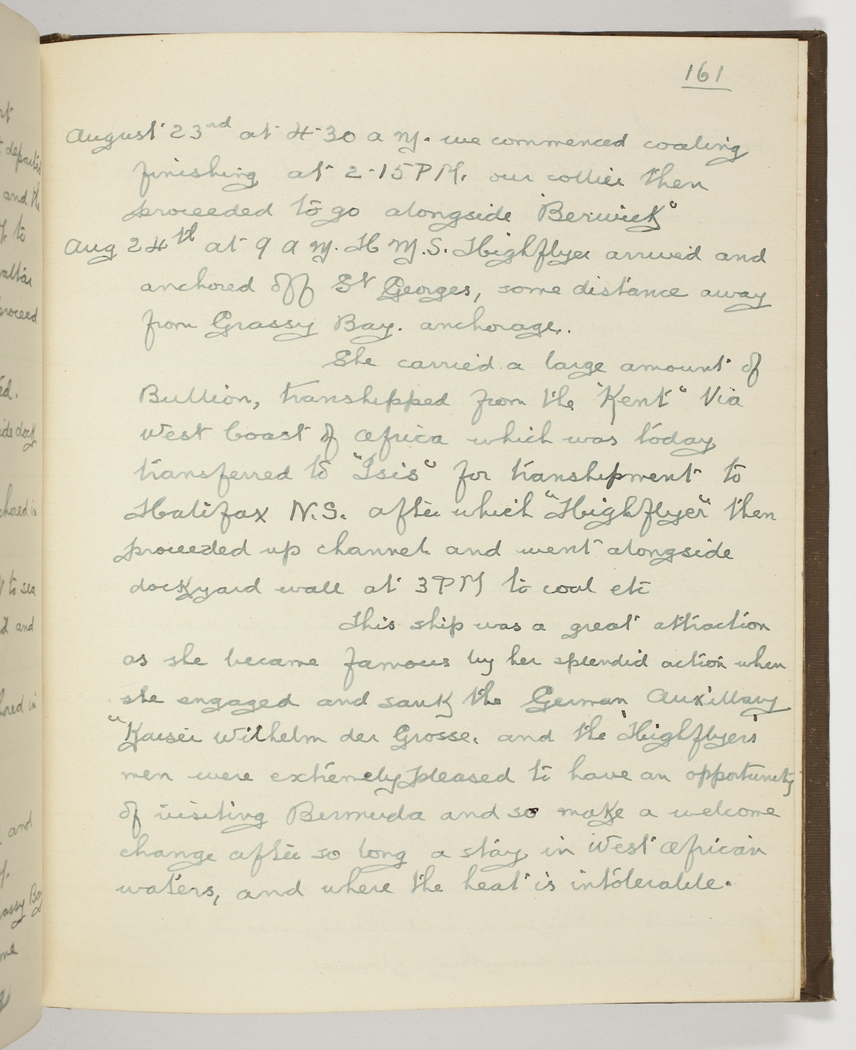 Aug 24th at 9 am. H.M.S. Highflyer arrived and anchored off St Georges, some distance away from Grassy Bay anchorage. She carried a large amount Bullion, transhipped from the "Kent" Via West Coast of Africa which was today transferred to "Isis" for transhipment to Halifax N.S. after which "Highflyer" then proceeded up channel and went alongside dockyard wall at 3 PM to coal etc – This ship was a great attraction a she became famous by her splendid action when she engaged and sank the German Auxillary "Kaiser Wilhelm der Grosse, and the "Highflyers" men were extremely pleased to have an opportunity of visiting Bermuda and so make a welcome change after so long a stay in West African waters, and where the heat is intolerable.