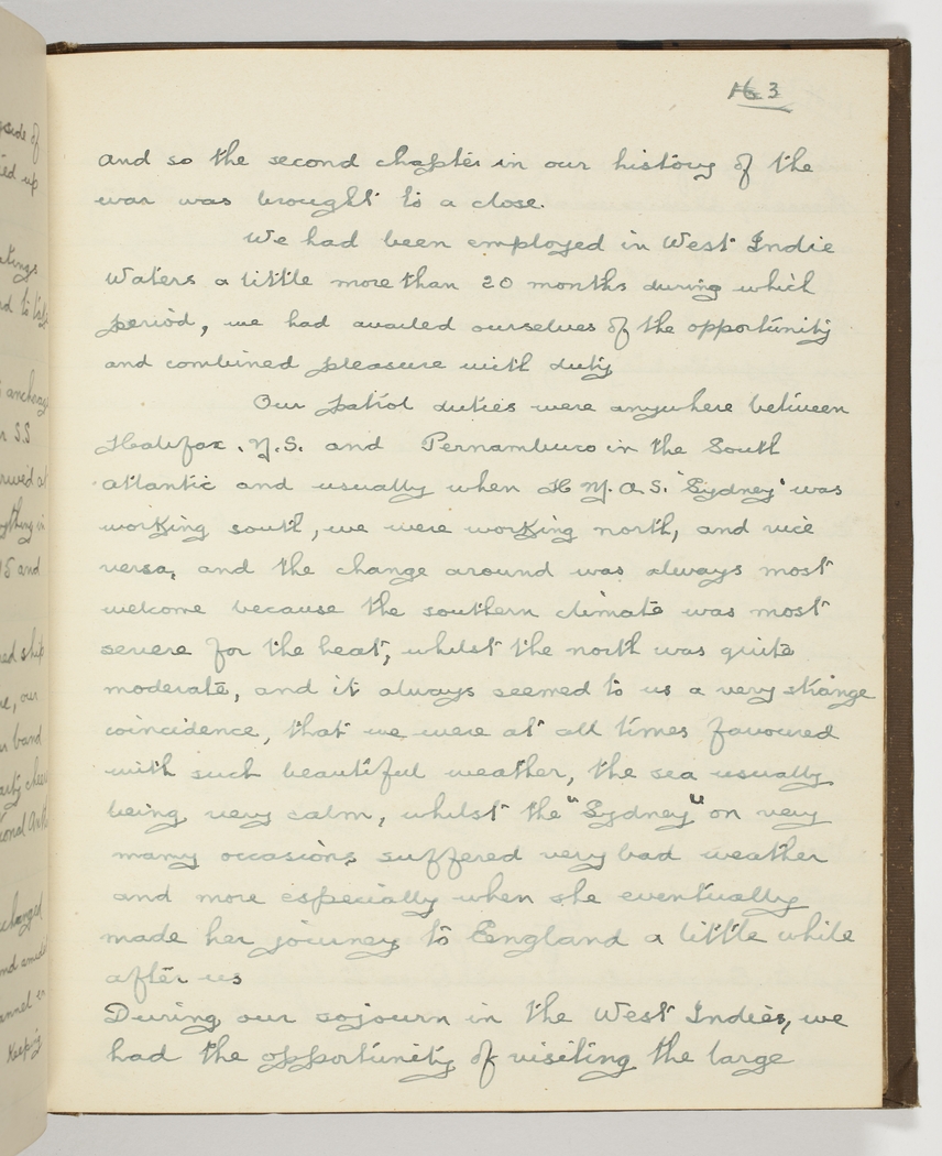 We had been employed in West Indie Waters a little more than 20 months during which period, we had availed ourselves of the opportunity and combined pleasure with duty – Our patrol duties were anywhere between Halifax N.S. and Pernambucco in the South Atlantic and usually when H.M.A.S. "Sydney" was working south, we were working north, and vice versa, - and the change around was always most welcome because the southern climate was most severe for the heat, whilst the north was quite moderate, and it always seemed to us a very strange coincidence, that we were at all times favoured with such beautiful weather, the sea being usually very calm, whilst the "Sydney" on very many occasions suffered very bad weather and more especially when she eventually made her journey to England a little while after us