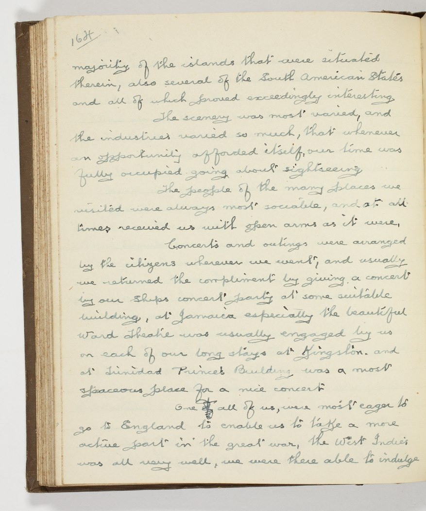 Concerts and outings were arranged by the citizens wherever we went, and usually we returned the compliment by giving a concert by our ships concert party at some suitable building, - at Jamaica especially the beautiful Ward Theatre was usually engaged by us on each of our long stays at Kingston. and at Trinidad Prince's Building was a most spacious place for a nice concert