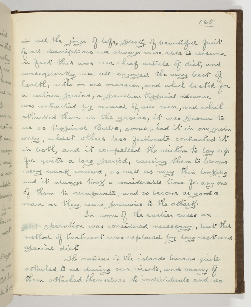 in all the joys of life, - plenty of beautiful fruit of all descriptions we always were able to consume in fact this was our chief article of diet, and consequently we all enjoyed the very best health, altho on one occasion, and which lasted for a certain period, a peculiar tropical disease was contracted by several of our men, and which attacked them in the groins, it was known to us as tropical Bubo, - some had it in one groin only, whilst others less fortunate contracted it in both, and it compelled the victim to lay up for quite a long period, causing them to become very weak indeed, as well as very thin looking and it always took a considerable time for any one of them to recuperate, and so become as good a man as they were previous to the attack. In some of the earlier cases an operation was considered necessary, but this method treatment was replaced by long rest and special diet