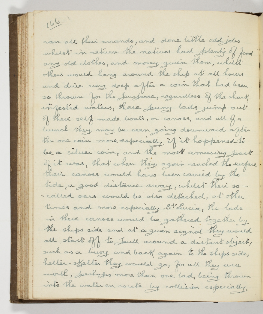 ran all their errands, and done little odd jobs whilst in return the natives had plenty of food any old clothes, and money given them, whilst others would hang around the ship at all hours and dive very deep after a coin that had been so thrown for the purpose, regardless of the shark infested waters, - these puny lads jump out of their self made boats, or canoes, and all of a bunch they may be seen going downward after one coin more especially if it happened to be a silver coin, and the most amusing part of it was, that when the again reached the surface their canoes would have been carried by the tide, a good distance away, whilst their so-called oars would also be detached, -