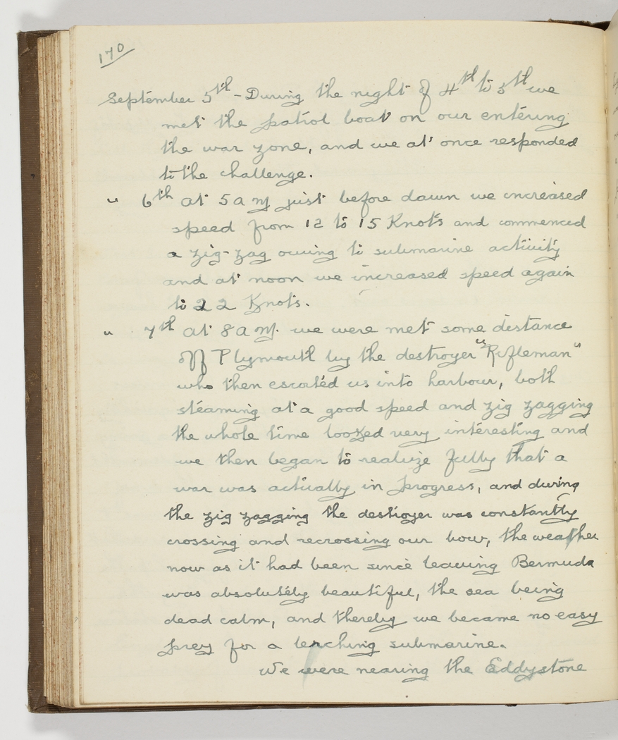 Sept 7th At 8 am. we were met some distance off Plymouth by the destroyer "Rifleman" who then escorted us into harbour, both steaming at a good speed and zig zagging the whole time – looked very interesting - and then we began to realize fully that a war was actually in progress, and during the zig sagging the destroyer was constantly crossing and recrossing our bow, - the weather now as it had been since leaving Bermuda was absolutely beautiful, the sea being dead calm, and thereby we became no easy prey for a lerching [lurking?] submarine. We were nearing the Eddistone