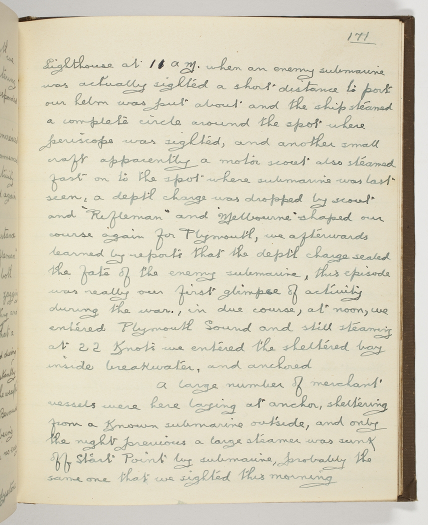 Lighthouse at 11 am. when an enemy submarine was actually sighted a short distance to port – our helm was put about and the ship steamed a complete circle around the spot where a periscope was sighted, and another small craft apparently a motor scout also steamed fast on to the spot where the submarine was last seen, - a depth charge was dropped by scout and "Rifleman" and "Melbourne" shaped our course again for Plymouth, - we afterwards learned by reports that the depth charge sealed the fate of the enemy submarine, this episode was really our first glimpse of activity during the war, - in due course, at noon, we entered Plymouth Sound and still steaming at 22 Knots we entered the sheltered bay inside breakwater, and anchored