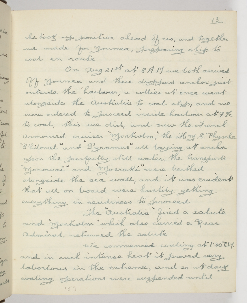 On Aug 21st at 8 Am we both arrived off Noumea and there dropped anchor just outside the harbour, a collier at once went alongside the Australia to coal ship, and we were ordered to proceed inside harbour at 9 o/c to coal, - this we did, and saw the French Armoured cruiser "Montcalm", the HMS Physche "Philomel" and "Pyramus" all laying at anchor upon the perfectly still water, - the transports "Monowai" and "Moeraki" were berthed alongside the sea wall, and it was evident that all on board were hastily getting everything in readiness to proceed.