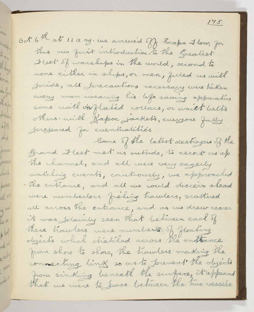 Oct 6th at 11 am. we arrived off Scapa Flow, for this our first introduction to the Greatest Fleet of warships in the world, second to none either in ships, or men, filled us with pride, - all precautions necessary were taken every man wearing his life saving apparatus some with inflated collars, or waist belts others with Kapoc jackets, everyone fully prepared for eventualities –