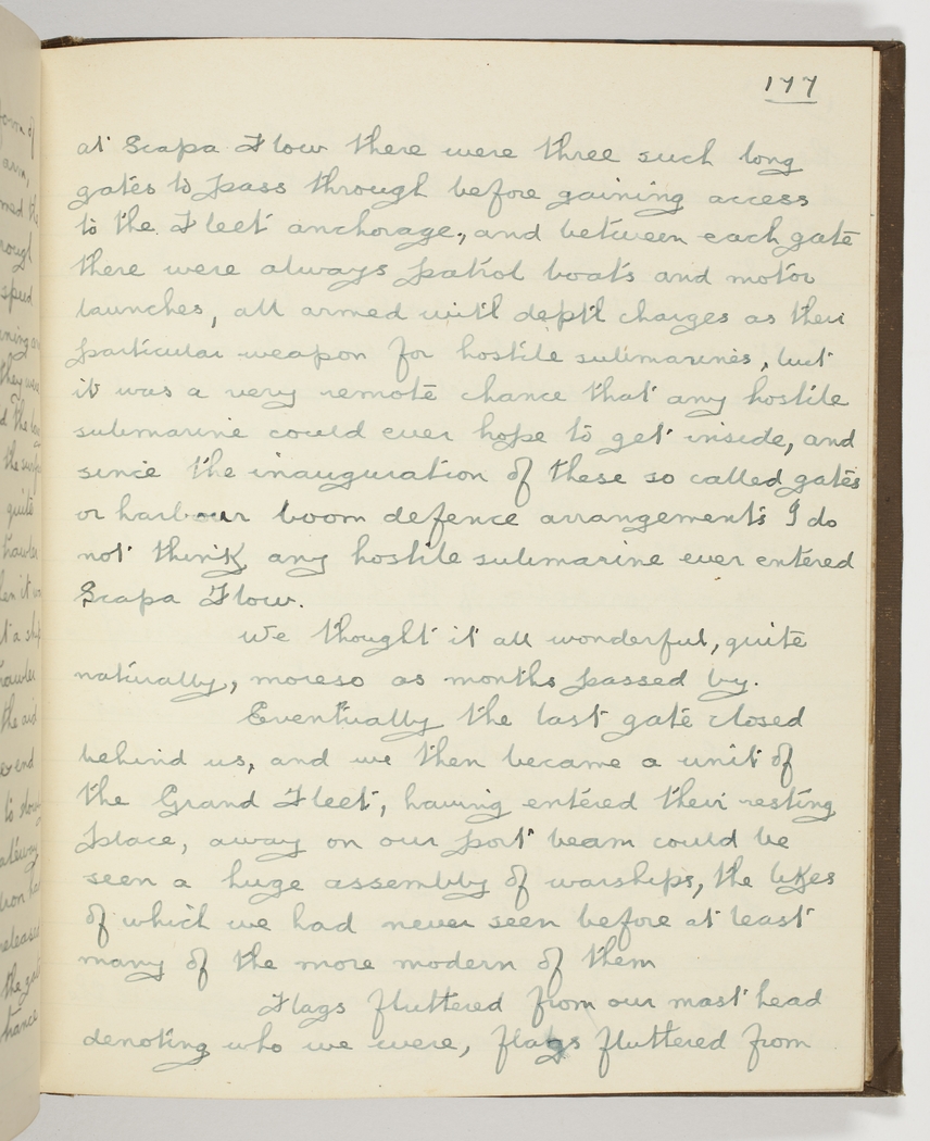 at Scapa Flow there were three such long gates to pass through before gaining access to the Fleet anchorage, and between each gate there were always patrol boats and motor launches, all armed with depth charges as their particular weapons for hostile submarines,- but it was a very remote chance that any hostile submarine could to ever hope to get inside, and since inauguration of these so called gates or harbour boom defence arrangements I do not think any hostile submarine ever entered Scapa Flow
