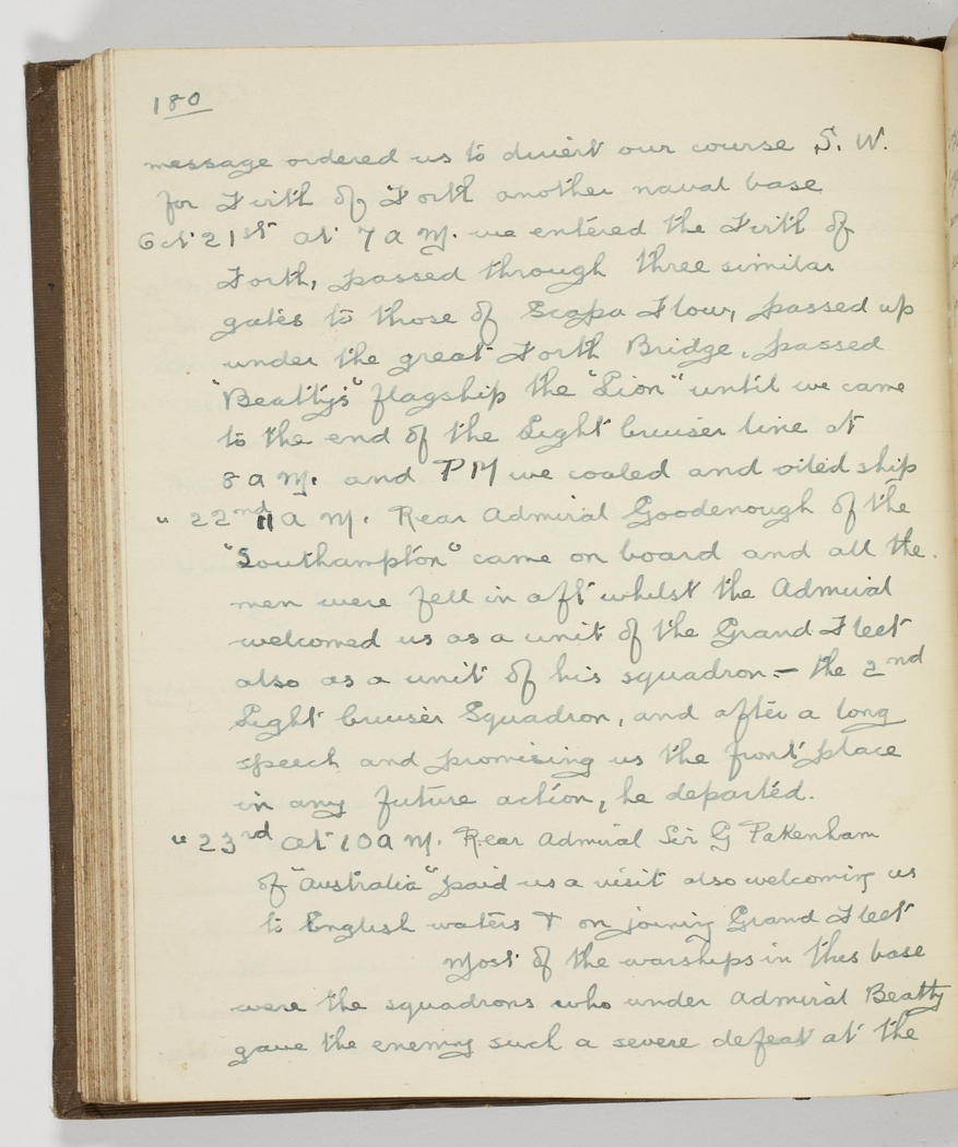 Oct 22nd 11 a m. Rear Admiral Goodenough of the "Southampton" came on board and all the men were fell in aft whilst the Admiral welcomed us as a unit of the Grand Fleet also as a unit of his squadron-- the 2nd Light Cruiser Squadron, and after a long speech and promising us the front place in any future action, he departed.