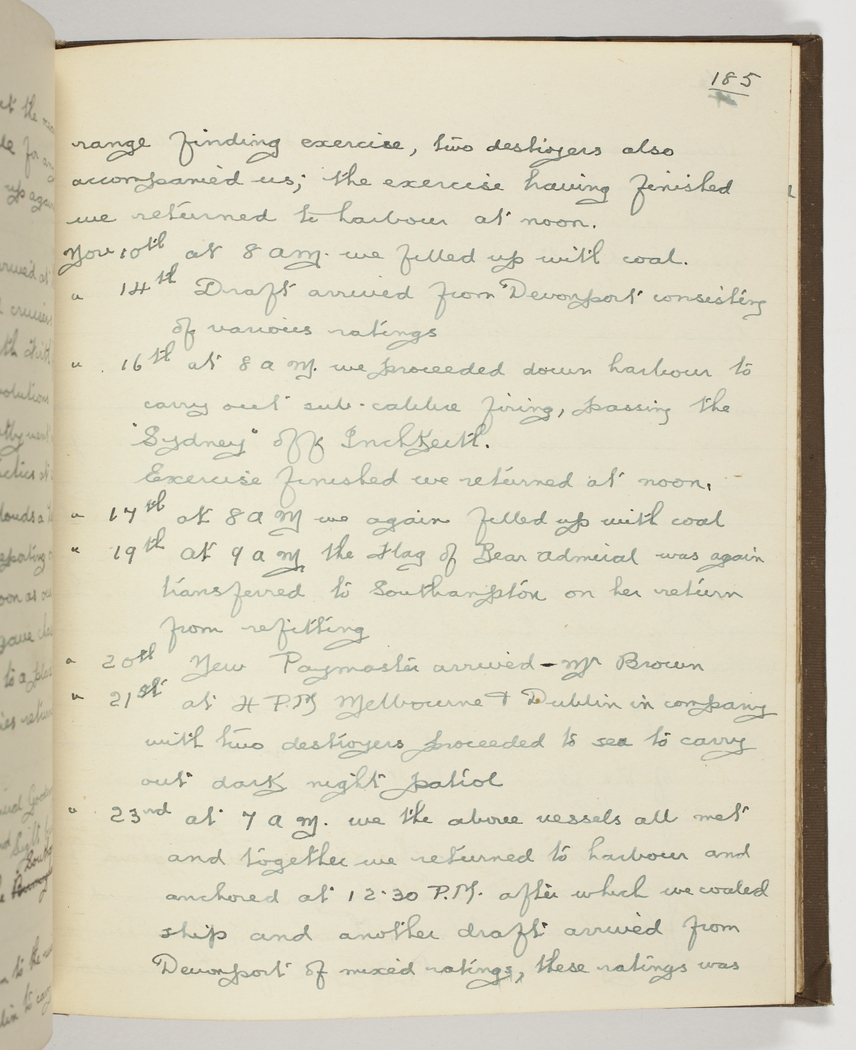 Nov 23rd at 7 am. we the above vessels all met and together we returned to harbour and anchored at 12.30 P.M. after which we coaled ship and another draft arrived from Devonport of mixed ratings, these ratings was
