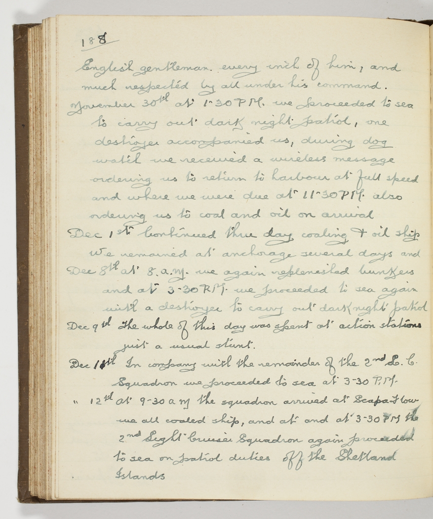 November 30th [1916] at 1.30 PM. we proceeded to sea to carry out dark night patrol, one destroyer accompanied us, - during dog watch we received a wireless message ordering us to return to harbour at full speed and where we were due at 11.30 PM. also ordering us to coal and oil on arrival